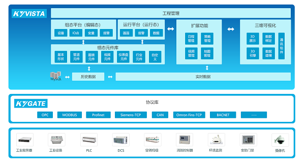 KyVista工業(yè)互聯(lián)網(wǎng)全景可視化集成平臺(tái)針對(duì)工業(yè)領(lǐng)域多種主流協(xié)議如Modbus (Serial Line and TCP)、OPC XML-DA、OPC UA 、PROFIBUS、PROFINET等,進(jìn)行數(shù)據(jù)采集及轉(zhuǎn)換,實(shí)現(xiàn)工業(yè)數(shù)據(jù)的采集、處理、存儲(chǔ)、遠(yuǎn)程配置與監(jiān)控、分析及圖形化展示,并做出智能分析、預(yù)警,靈活支持各種工業(yè)應(yīng)用。