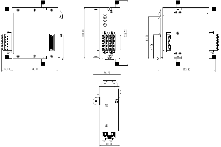 | 機械結構 | 機械結構 鋁質外殼 防護等級 IP20 尺寸 40mm x 100mm x 90mm (W x H x D) 整機重量 500g 安裝方式 導軌安裝 |