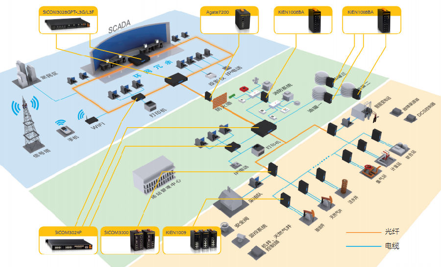 智 能化的數(shù)字油氣田建設(shè)需要構(gòu)建一個安全、高效、可靠的自動化網(wǎng)絡(luò),以提高油田生產(chǎn)、強化生產(chǎn)過程控制、輔助生產(chǎn)管理等。通過有線光纖傳輸網(wǎng)絡(luò)和無線傳輸網(wǎng) 絡(luò),實現(xiàn)油氣田井區(qū)、計量間、集輸站、聯(lián)合站、處理廠之間的生產(chǎn)數(shù)據(jù)、設(shè)備狀態(tài)信息實時傳輸、共享。并可在作業(yè)區(qū)生產(chǎn)指揮中心及生產(chǎn)控制中心進行集中管理 和控制。由于網(wǎng)絡(luò)系統(tǒng)承載了視頻監(jiān)控、采集數(shù)據(jù)和控制數(shù)據(jù),因此,一個高帶寬,具有優(yōu)良的冗余性、安全性、實時性和可靠性的骨干網(wǎng)絡(luò)成為油田自動化的主要 需求。