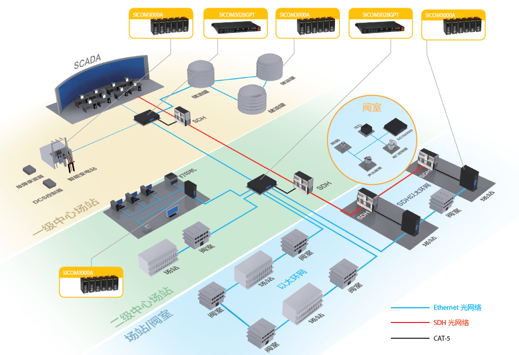 石油/天然氣輸送管線是石油、天然氣輸運(yùn)的主要途徑之一,其自動(dòng)化系統(tǒng)主要包括SCADA系統(tǒng)、工業(yè)電視系統(tǒng)、語(yǔ)音系統(tǒng)等,網(wǎng)絡(luò)通信系統(tǒng)需為各子系統(tǒng)提供實(shí)時(shí)、穩(wěn)定的多業(yè)務(wù)通信平臺(tái)。網(wǎng)絡(luò)設(shè)備分布在調(diào)控中心、場(chǎng)站、閥室等節(jié)點(diǎn),各節(jié)點(diǎn)間的通信設(shè)施有SDH系統(tǒng)或光纖系統(tǒng),通信設(shè)備需具備對(duì)各類通信設(shè)施的接入能力,并在各種地理環(huán)境和自然環(huán)境中為SCADA等子系統(tǒng)提供可靠的數(shù)據(jù)傳輸服務(wù)。