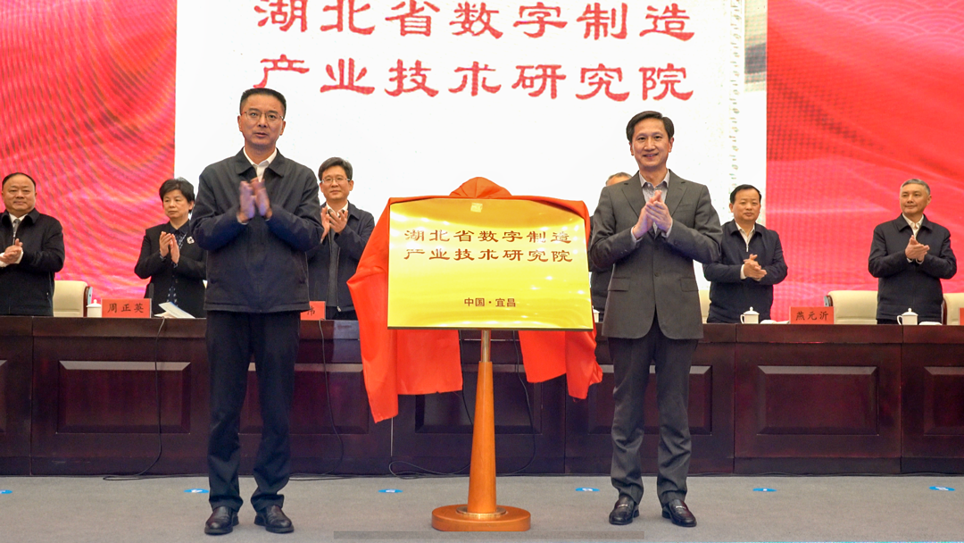 中共宜昌市委書記熊征宇(左)、北京東土科技董事長(zhǎng)李平(右)共同為湖北省數(shù)字制造產(chǎn)業(yè)技術(shù)研究院揭牌