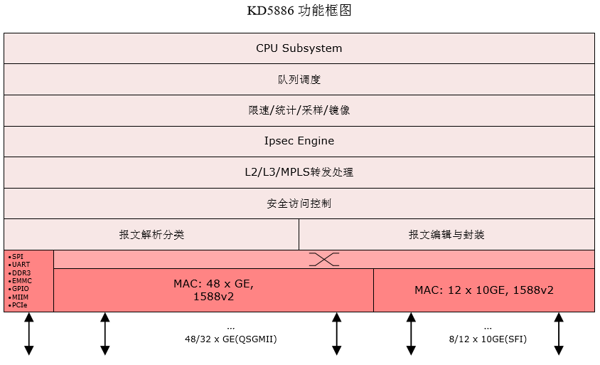 KD5886 是芯片前端設(shè)計(jì)、后端設(shè)計(jì)、仿真驗(yàn)證、芯片制造、封裝與測(cè)試全流程在國(guó)內(nèi)自主 研制完成的 128G/152G 安全以太網(wǎng)交換芯片, 可應(yīng)用在園區(qū)網(wǎng)絡(luò)和城域以太網(wǎng)絡(luò)接入/匯聚場(chǎng) 景。KD5886 提供多種以太網(wǎng)接口配置(可配置 IPsec 流量):