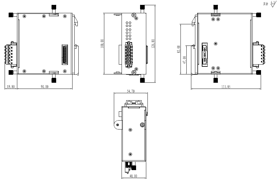 | 機械結構 | 機械結構 鋁質(zhì)外殼 防護等級 IP30 尺寸 40mm x 100mm x 90mm (W x H x D) 整機重量 500g 安裝方式 導軌安裝 |