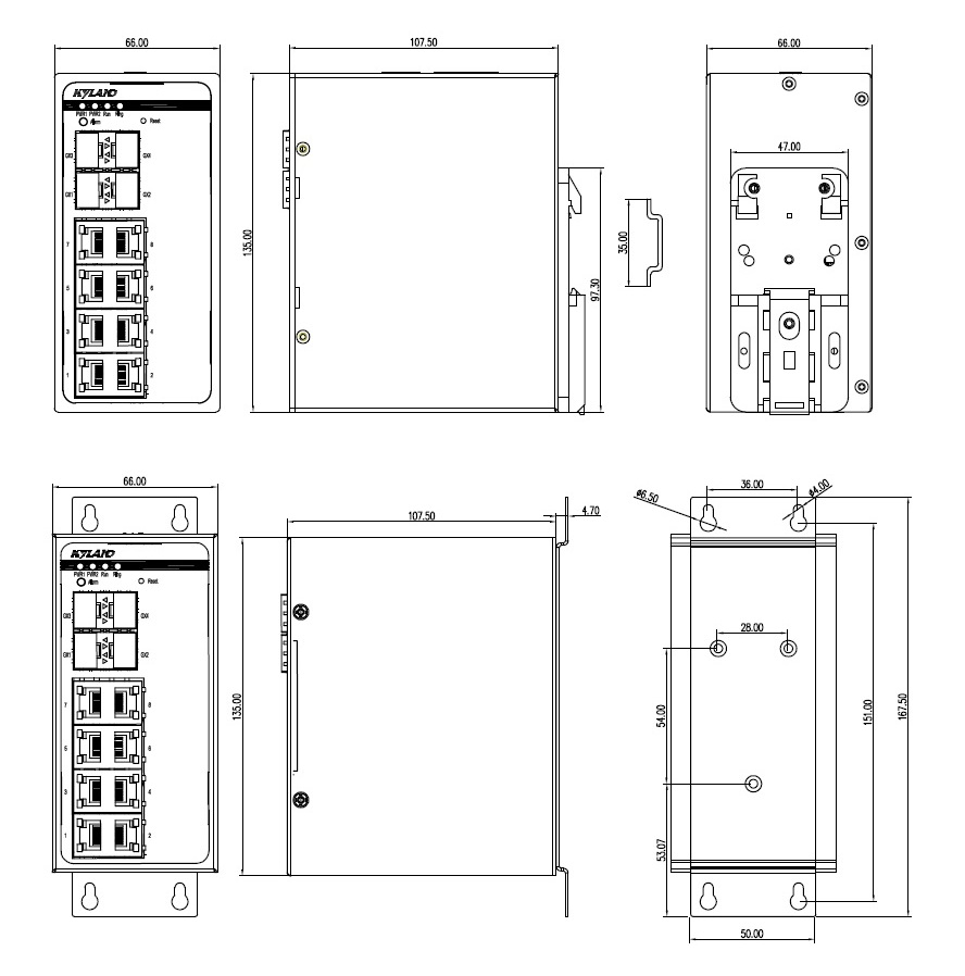 66mm×135mm×107.5mm(W×H×D): 6T=6×10/100Base-T(X) RJ45電口 8T=8×10/100Base-T(X) RJ45電口 2SFP8T=2×100Base-X SFP接口; 8×10/100Base-T(X) RJ45電口 2GX8T=2×100Base-X, 1000Base-X, 10/100/1000Base-T(X) SFP接口; 8×10/100Base-T(X) RJ45電口 4SFP8T=4×100Base-X SFP接口; 8×10/100Base-T(X) RJ45電口 4GX8T=4×100Base-X, 1000Base-X, 10/100/1000Base-T(X) SFP接口; 8×10/100Base-T(X) RJ45電口