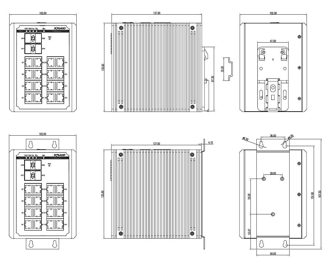 | 機(jī)械結(jié)構(gòu) | 外殼 金屬材質(zhì) 散熱方式 自然冷卻,無(wú)風(fēng)扇 防護(hù)等級(jí) IP40及以上 尺寸 66mm×135mm×107.5mm (6T,8T,2GX8T,4GX8T) (W×H×D) 88mm×135mm×137mm (8GE,2GX8GE,4GX8GE) (W×H×D) 102mm×135mm×137mm (16GE,2GX16GE,4GX16GE,8GX8GE,12GX8GE) (W×H×D) 重量 1.1Kg (6T,8T,2GX8T,4GX8T) 1.5Kg (8GE,2GX8GE,4GX8GE) 1.9Kg (16GE,2GX16GE,4GX16GE,8GX8GE,12GX8GE) 安裝方式 DIN卡軌式或壁掛式 |