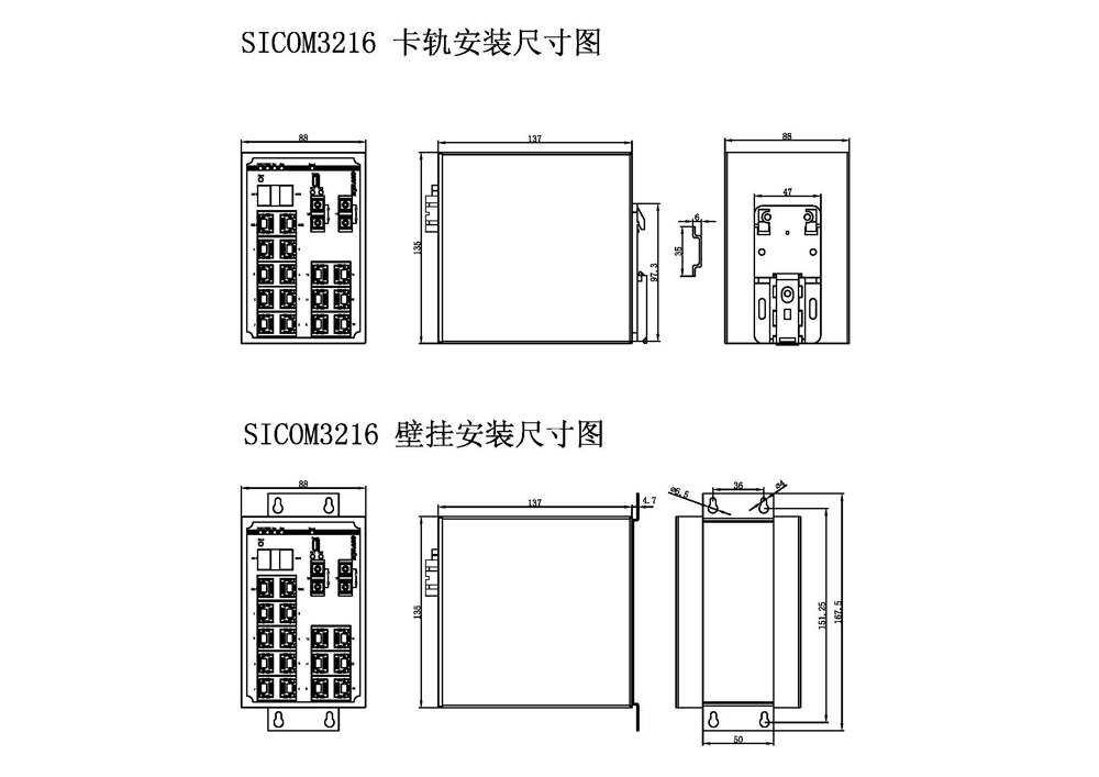 | 機械結(jié)構(gòu) | 外殼 金屬材質(zhì) 散熱方式 自然冷卻,無風(fēng)扇 防護等級 IP40 尺寸 88mm×135mm×137mm(W×H×D) 重量 1.25Kg 安裝方式 DIN卡軌式或壁掛式 |